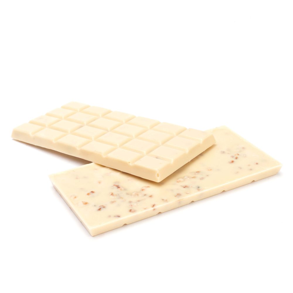 Tablettes de chocolat blanc avec croquant de bresillienne à l’intérieur.